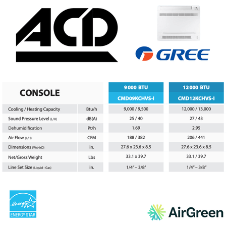 At AirGreen, we understand the importance of a comfortable and healthy home environment. That's why we are proud to introduce the Floor Console ACD, a cutting-edge air conditioning and heating solution designed to deliver exceptional performance and unmatched energy efficiency. With its Energy Star certification and the use of the eco-friendly R-410A refrigerant, this console is a responsible choice for your home and the planet.