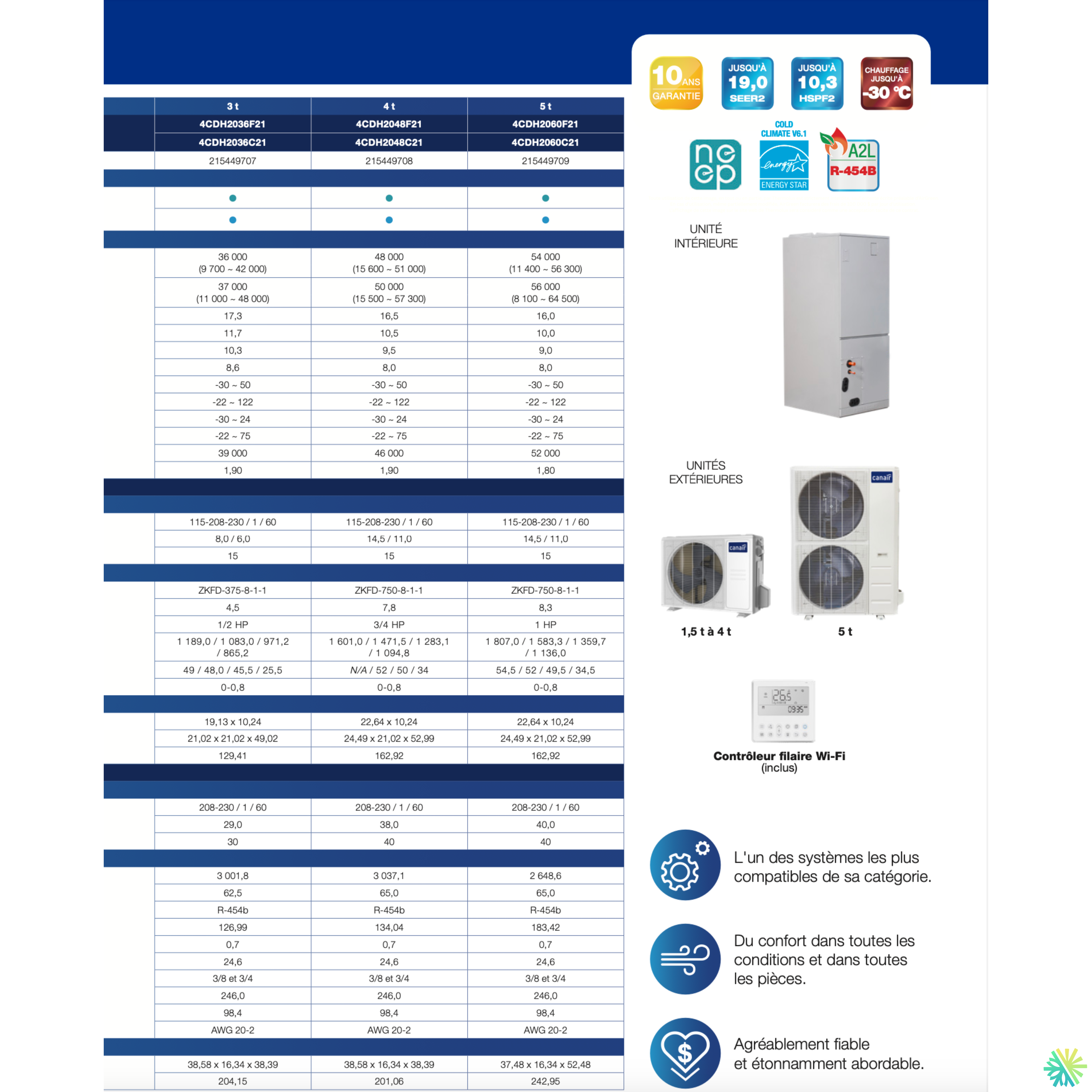 By choosing the CANAIR 4CDH R-454B | 5 Tons , you are choosing a complete, robust, ecological and high-performance HVAC system. Thanks to its ECM motor, its eco-responsible refrigerant, its ENERGY STAR certification and its quiet operation, it redefines the standards of modern comfort in Quebec.