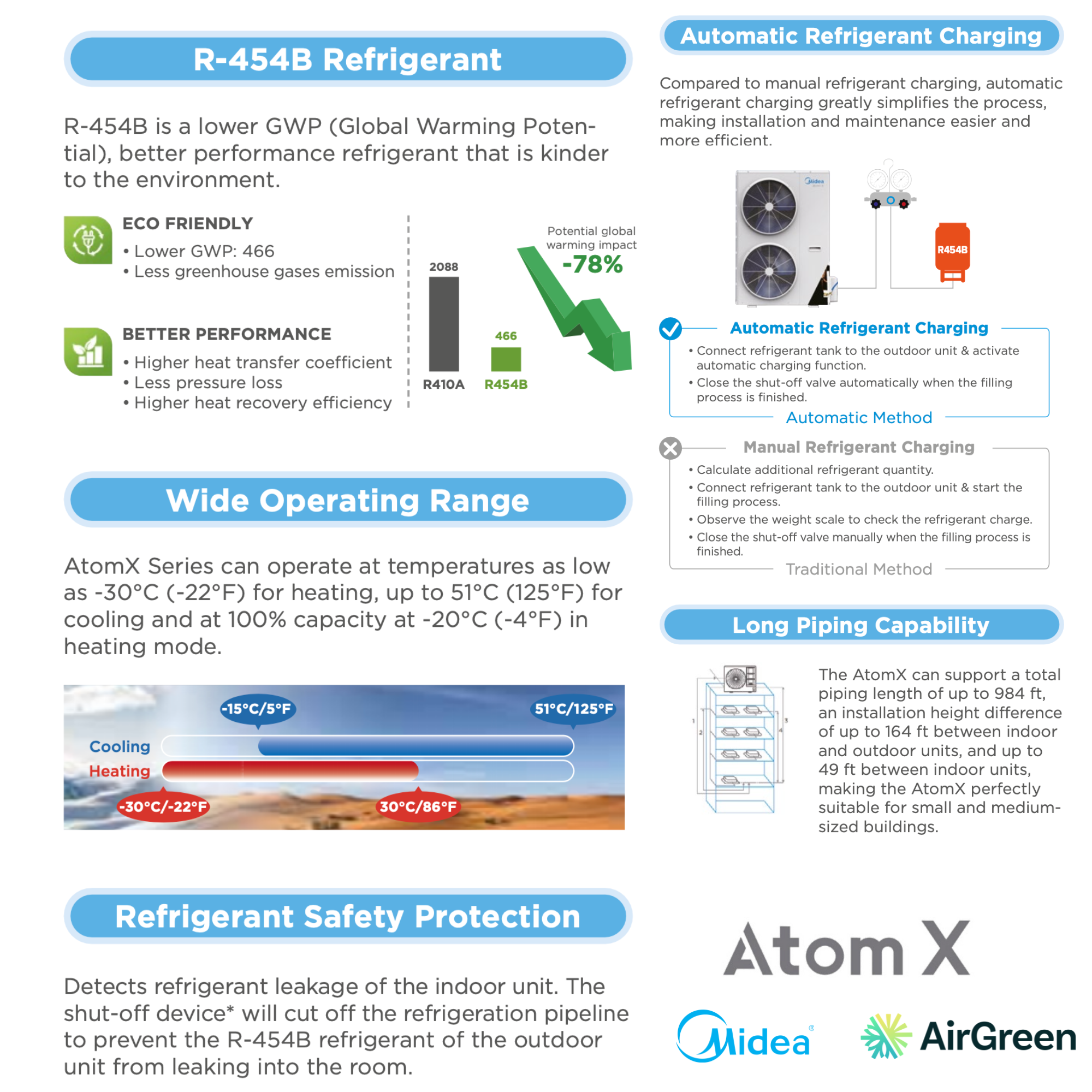 One of the most innovative features of the ATOM X system is the use of R-454B refrigerant , a new generation refrigerant. This gas has a global warming potential (GWP) of 466 , which is 78% lower than traditional R-410A.