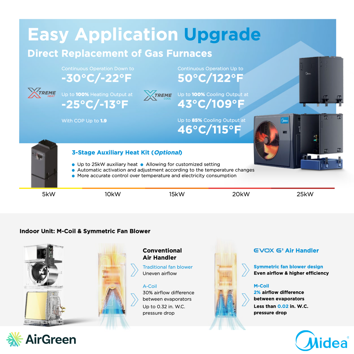 The MIDEA EVOX G3 is designed to withstand the harshest Quebec winters . Thanks to its high-performance M-Powevi compressor , it offers constant heating power down to -25°C (-13°F) , and remains operational down to -30°C (-22°F) .