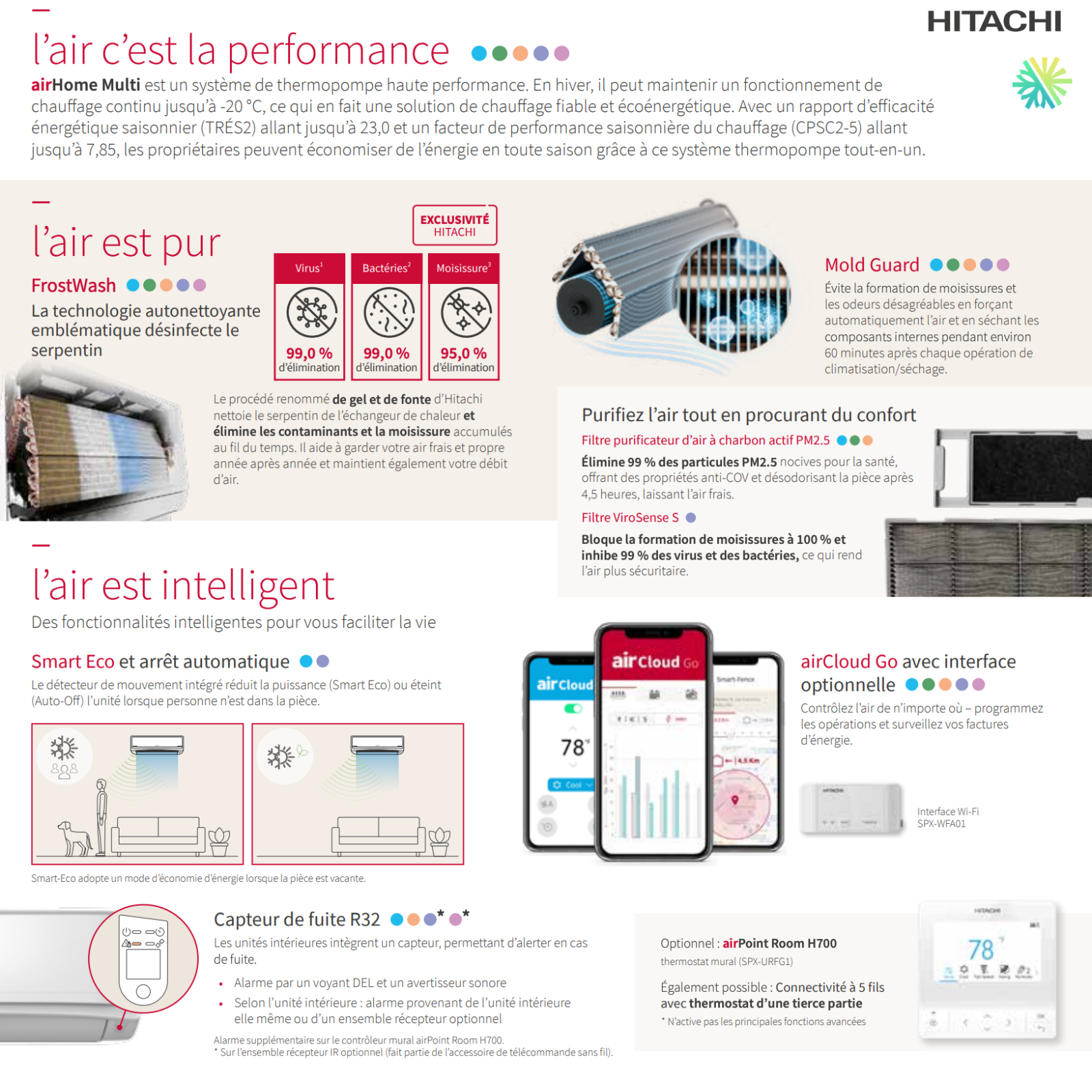 Safety is not overlooked. The system incorporates an R-32 leak sensor that automatically triggers a light signal and an audible alarm in the event of an anomaly, ensuring immediate protection for occupants and technicians.