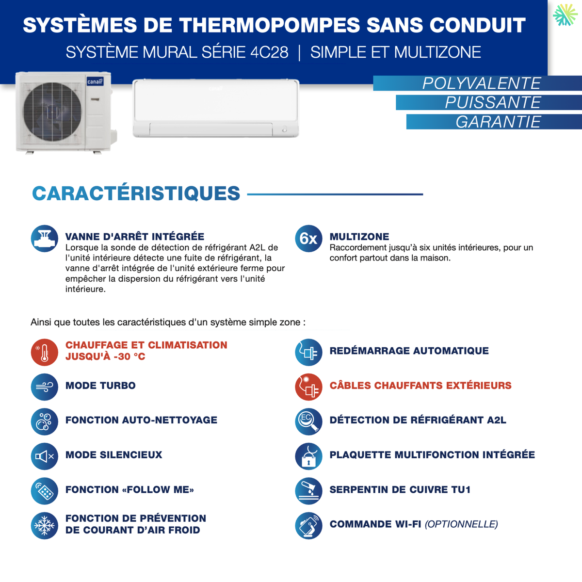 The CANAIR 4C28 is the result of local expertise, developed to meet the needs of residents of Montreal, Laval, Longueuil, the North Shore and the South Shore . This Cold Climate V6.1 model, ENERGY STAR® certified, offers an impressive heating capacity down to -30°C , which places it among the most robust systems on the Quebec market.