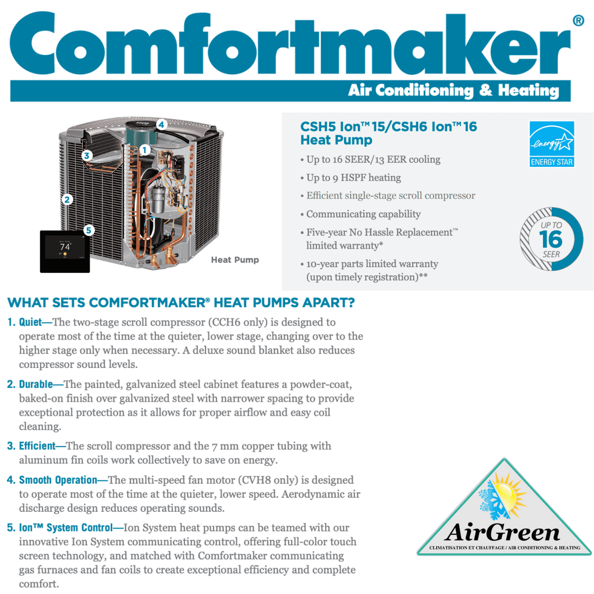 The SoftSound Deluxe CSH6 central heat pump features a unique Comfortmaker made scroll single-stage compressor for electric heating and cooling. It can be paired with a gas or electric furnace, as well as a compatible thermostat for dual combustion heating efficiency in colder climates. You can also enjoy the convenience of WiFi remote access and the assurance of the highest levels of performance and comfort management when paired with a complete Observer® communication system from Comfortmaker. This includes in particular the Energy-smart Observer communicating wall control with Wi-Fi® functionality.
