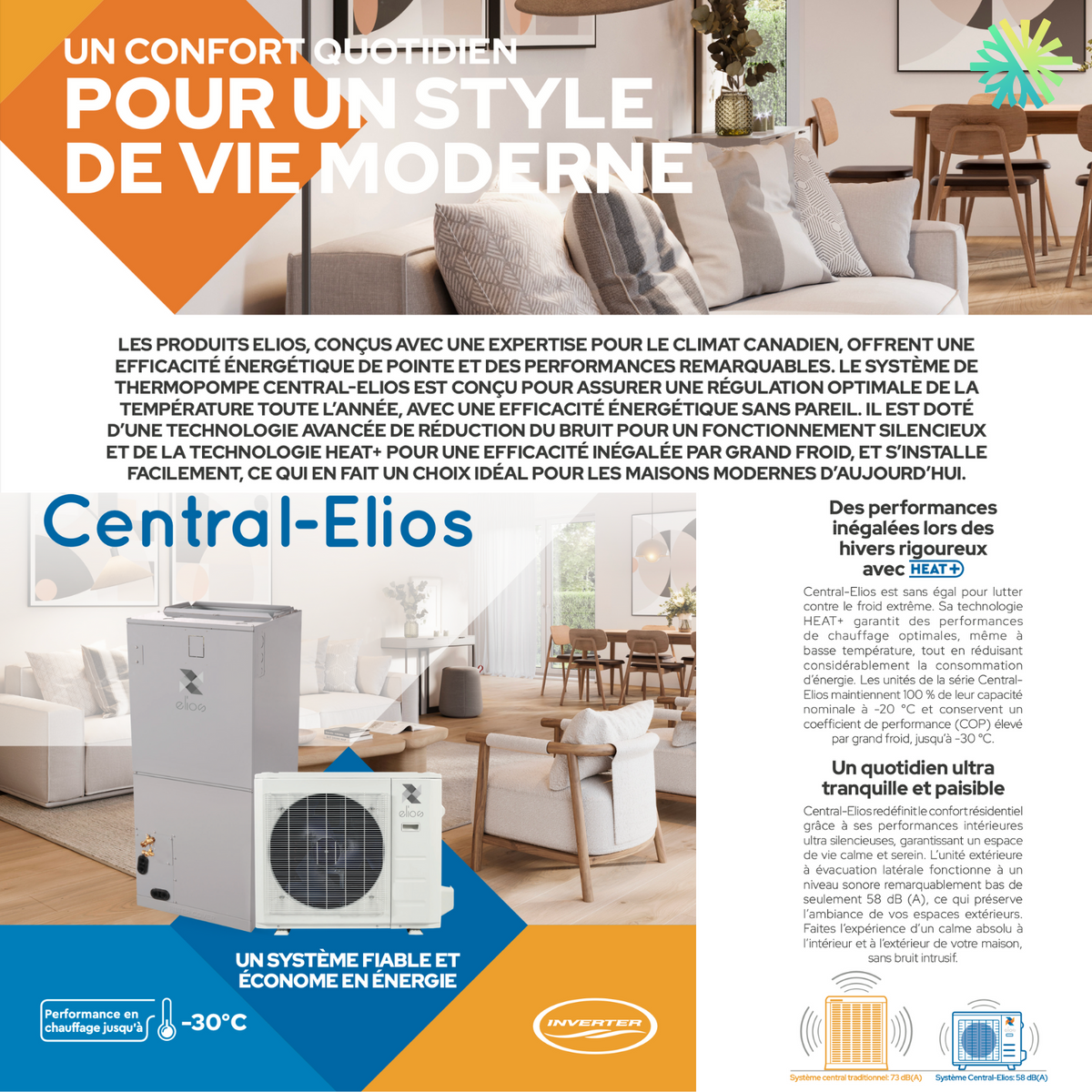 The Central Heat Pump ELIOS is the ideal solution to maintain a comfortable temperature in your home, regardless of the weather conditions. Designed for the harsh winters of Montreal, Laval, Longueuil, as well as the South Shore and North Shore regions, this high-performance heat pump ensures optimal comfort throughout the year. With a heating capacity at extreme temperatures down to -30°C and a cooling capacity of 24,000 BTU, it stands out for its efficiency and reliability.
