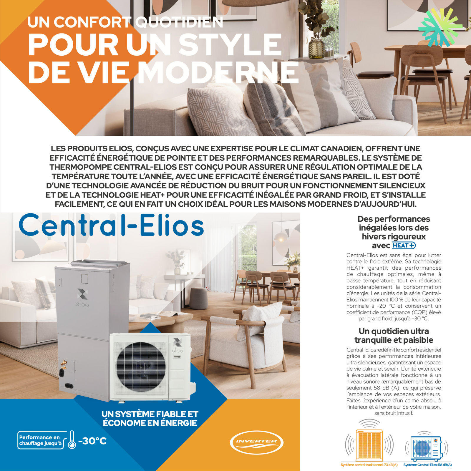 The HEAT+ technology allows the ELIOS heat pump to maintain 100% of its nominal capacity even at extreme temperatures of -20°C, and to operate efficiently down to -30°C. This ensures optimal heating performance throughout the harsh Canadian winter.