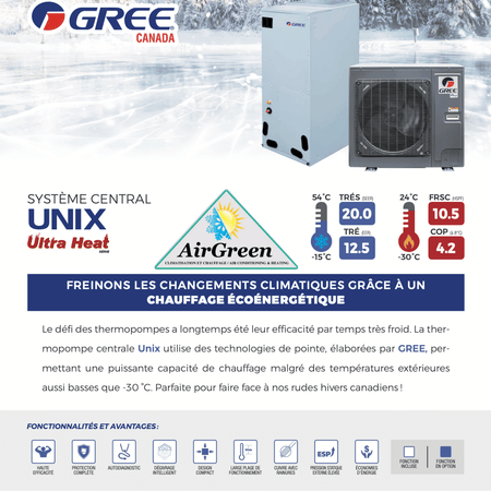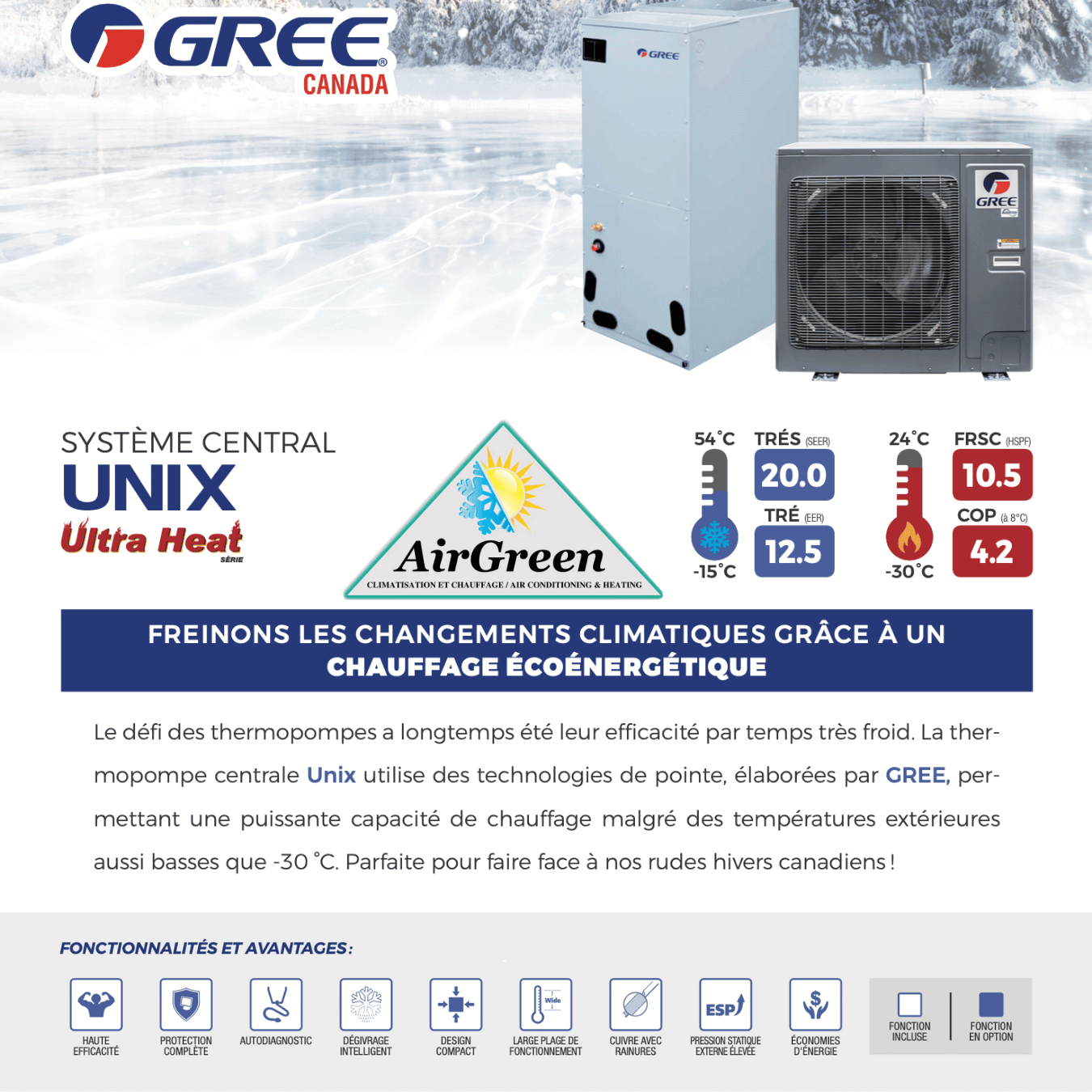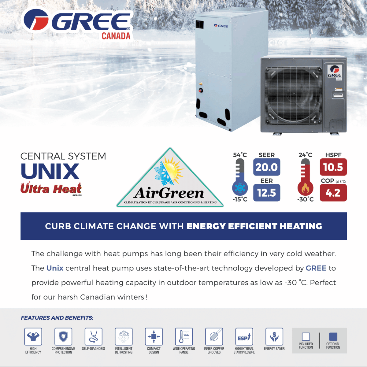 AirGreen, your Montreal-based HVAC company, is proud to introduce the Gree Unix 3 ton Central Heat Pump. When you think of a sustainable and energy-efficient solution for your heating and cooling needs, think of the Gree Unix Central Heat Pump. It's designed to provide you with absolute comfort while helping curb global warming.