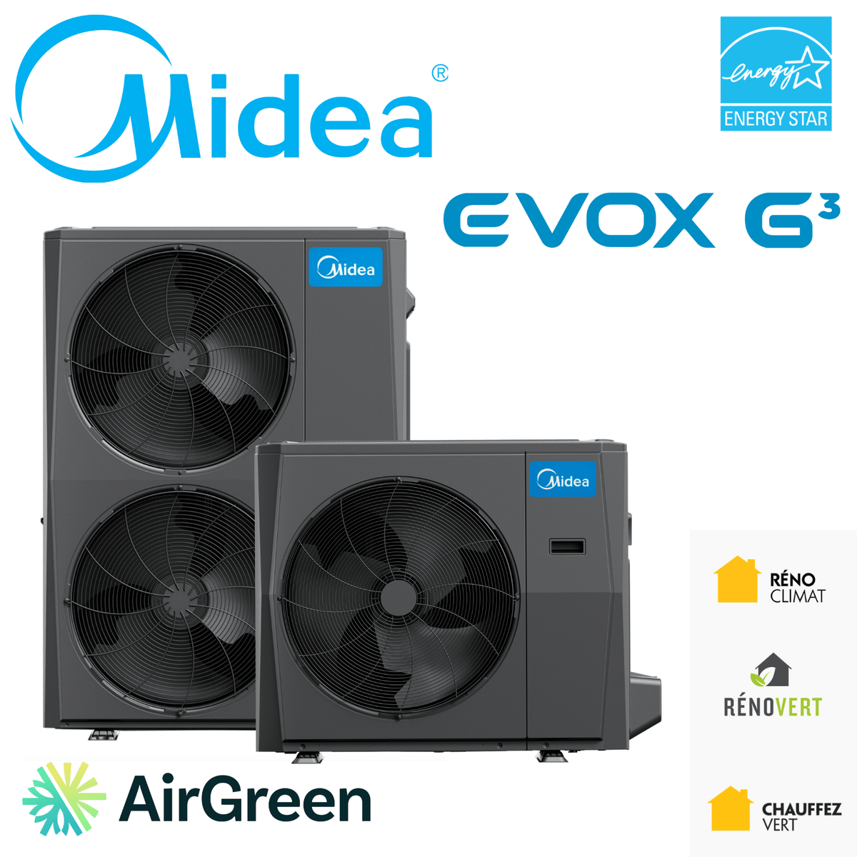 At AirGreen, we understand that heating and cooling needs in Montreal , Laval , Longueuil , North Shore and South Shore require robust, quiet solutions that are adapted to harsh climatic conditions. That's why we offer the installation of the MIDEA EVOX G3 | 1.5 Ton central heat pump , a state-of-the-art system designed to provide total comfort all year round, even at -30°C.