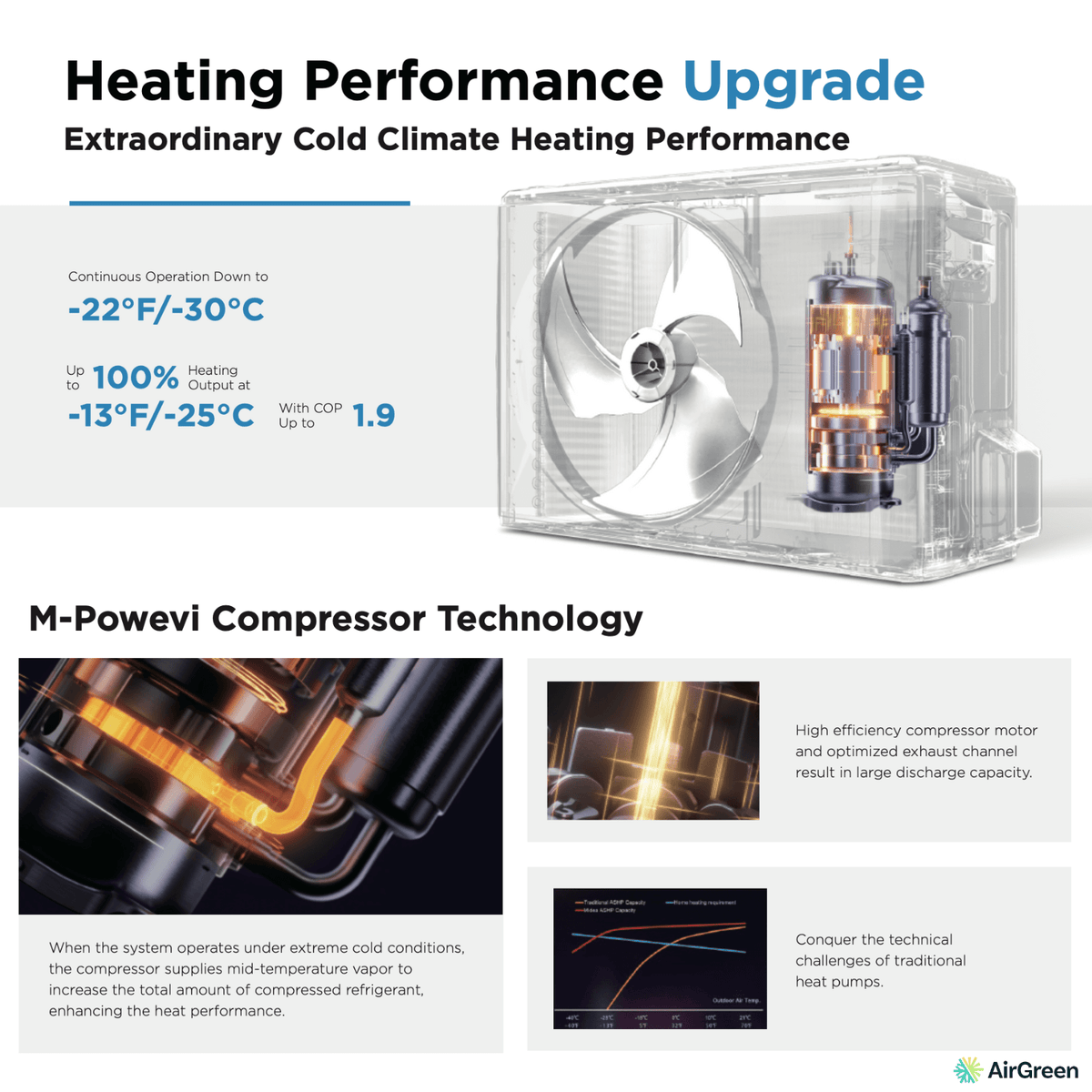 The MIDEA EVOX G3 Central Heat Pump is one of the few on the market to offer 100% heating capacity down to -25°C , and continuous operation down to -30°C . Tested to the stringent requirements of the U.S. Department of Energy's Cold Climate Heat Pump Technology Challenge , it achieves a COP of 1.92 at -25°C , exceeding cold climate performance standards.