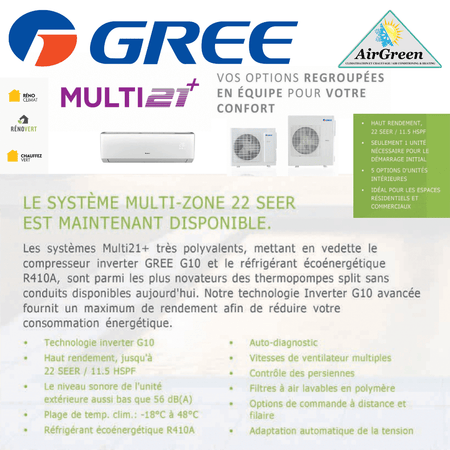 The 22 SEER Multi21+ systems are very versatile. Thanks to the GREE G10 inverter compressor and the energy-efficient R410A refrigerant, these are among the most efficient ductless split heat pumps available today in Quebec. Indeed, GREE's advanced G10 Inverter technology provides maximum efficiency while reducing your energy consumption.