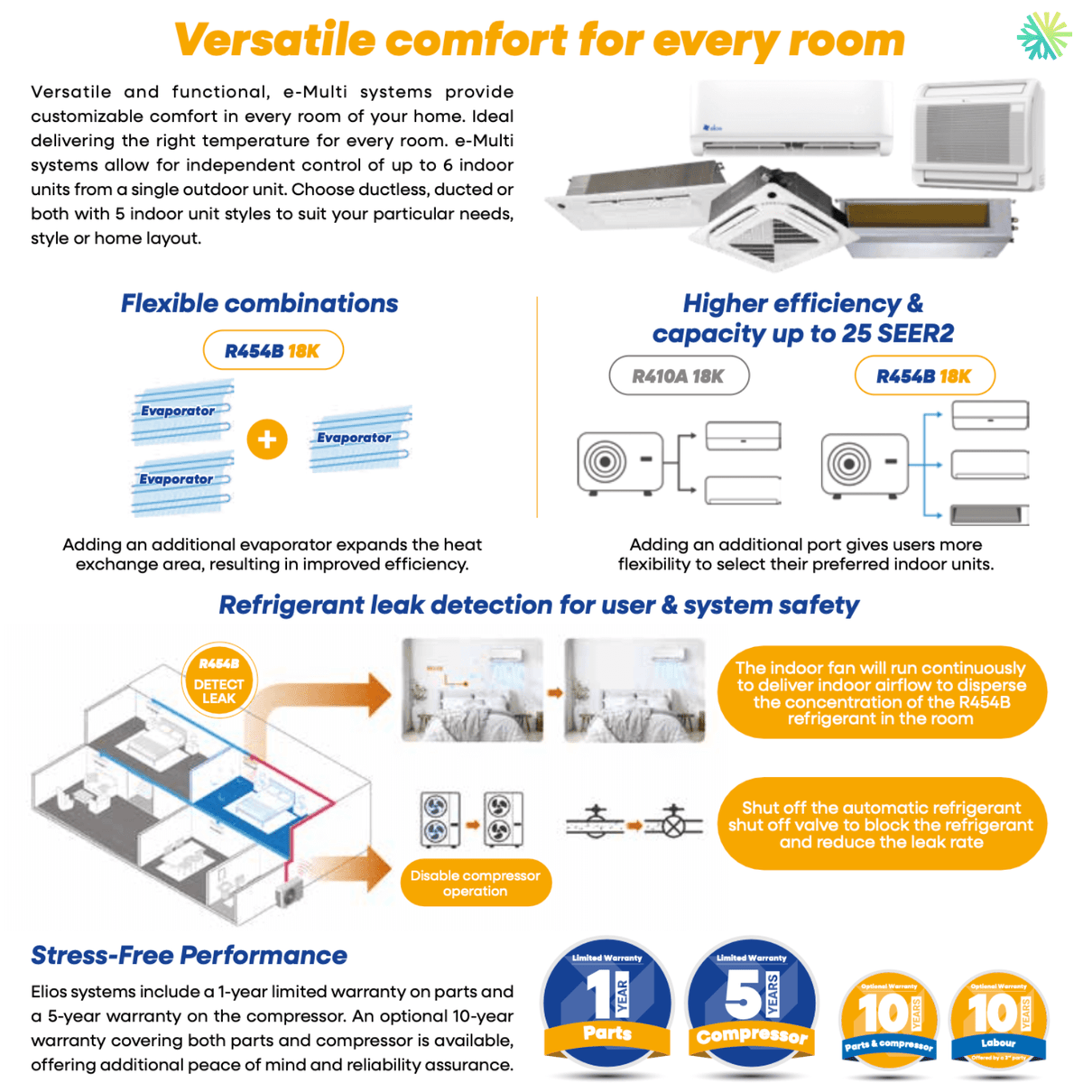 The ELIOS E-MULTI model comes with a basic 10-year warranty on the compressor, 10 years on parts, and 0 years on labor , with the option to extend. We always clearly explain the actual scope of these warranties to our customers, including what is and isn't covered in the event of a service call or diagnostic.