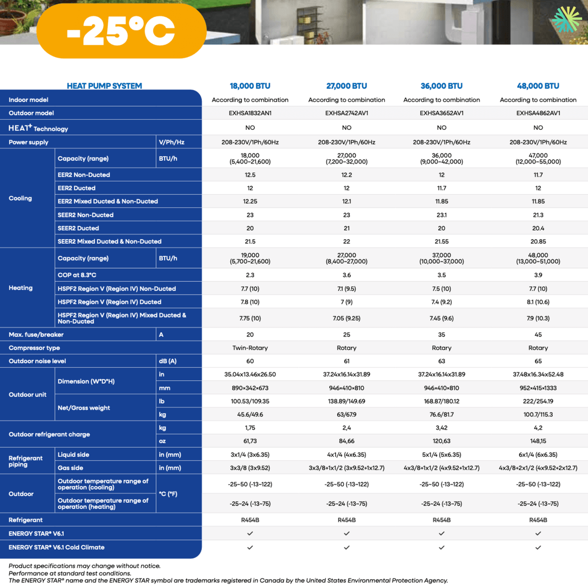 With a cooling capacity of 27,000 BTU and a useful heating output of 18,000 BTU at -8°C , this system efficiently covers typical areas of multi-story homes or large condominiums. SEER2 , HSPF2 , and COP values demonstrate consistent seasonal performance that meets local climate requirements, making it suitable for installations eligible for energy efficiency programs.