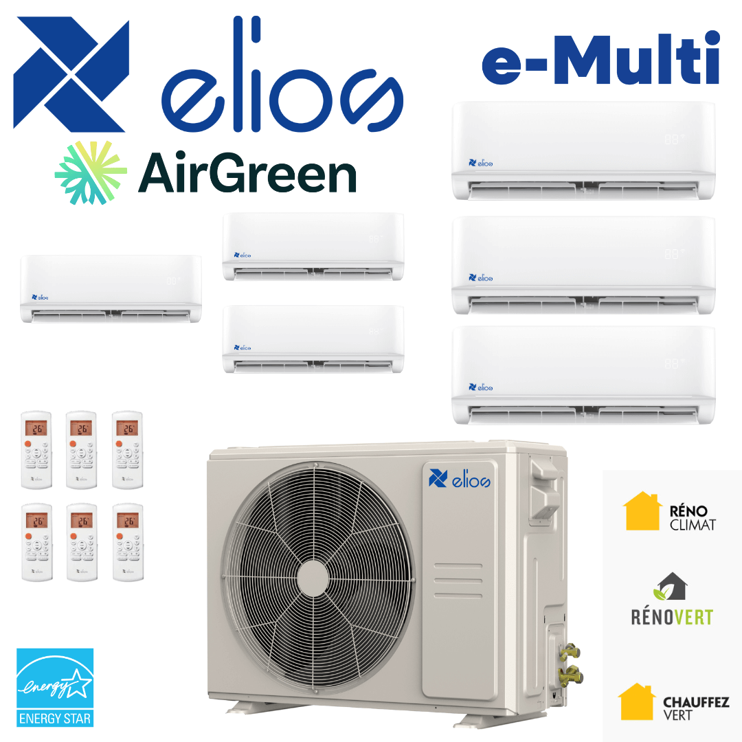 At AirGreen, we have been installing multi-zone HVAC systems for years in single-family homes, duplexes, and multi-unit buildings in Longueuil , Montreal , Laval , and on the North and South Shores . The ELIOS E-MULTI 6-head heat pump with a 48,000 BTU compressor is one of the systems we recommend when the needs are clear: to efficiently heat and cool multiple rooms, with precise zone control, without requiring multiple outdoor units.