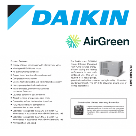 The Daikin DP14HM Packaged Heat Pump is more than an HVAC system; it's a commitment to a better living experience. With AirGreen, you're choosing a partner that values your comfort as much as you do. We invite you to embrace the tranquility and efficiency of the DP14HM, and enjoy the peace of mind that comes with it.