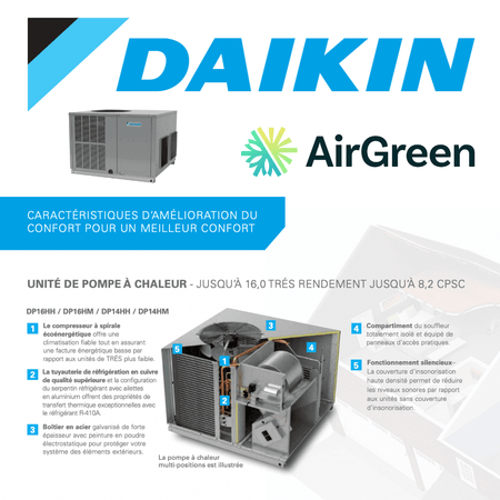 In the heart of Montreal and extending our reach to Laval, Longueuil, North Shore, and South Shore, AirGreen is your trusted HVAC ally, bringing you the pinnacle of home comfort with the Daikin DP16HM Packaged Heat Pump. This 16 SEER, two-stage, downflow/horizontal unit is not just a machine; it's a promise of consistent, energy-efficient temperature control for your home or business.