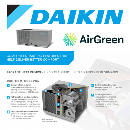 At AirGreen, we understand that the heart of your home in Montreal, Laval, Longueuil, and beyond, is where warmth meets innovation. With the Daikin DP5HH Packaged Heat Pump, we bring you a blend of top-tier technology and unmatched efficiency, ensuring your living space is a haven of comfort all year round.