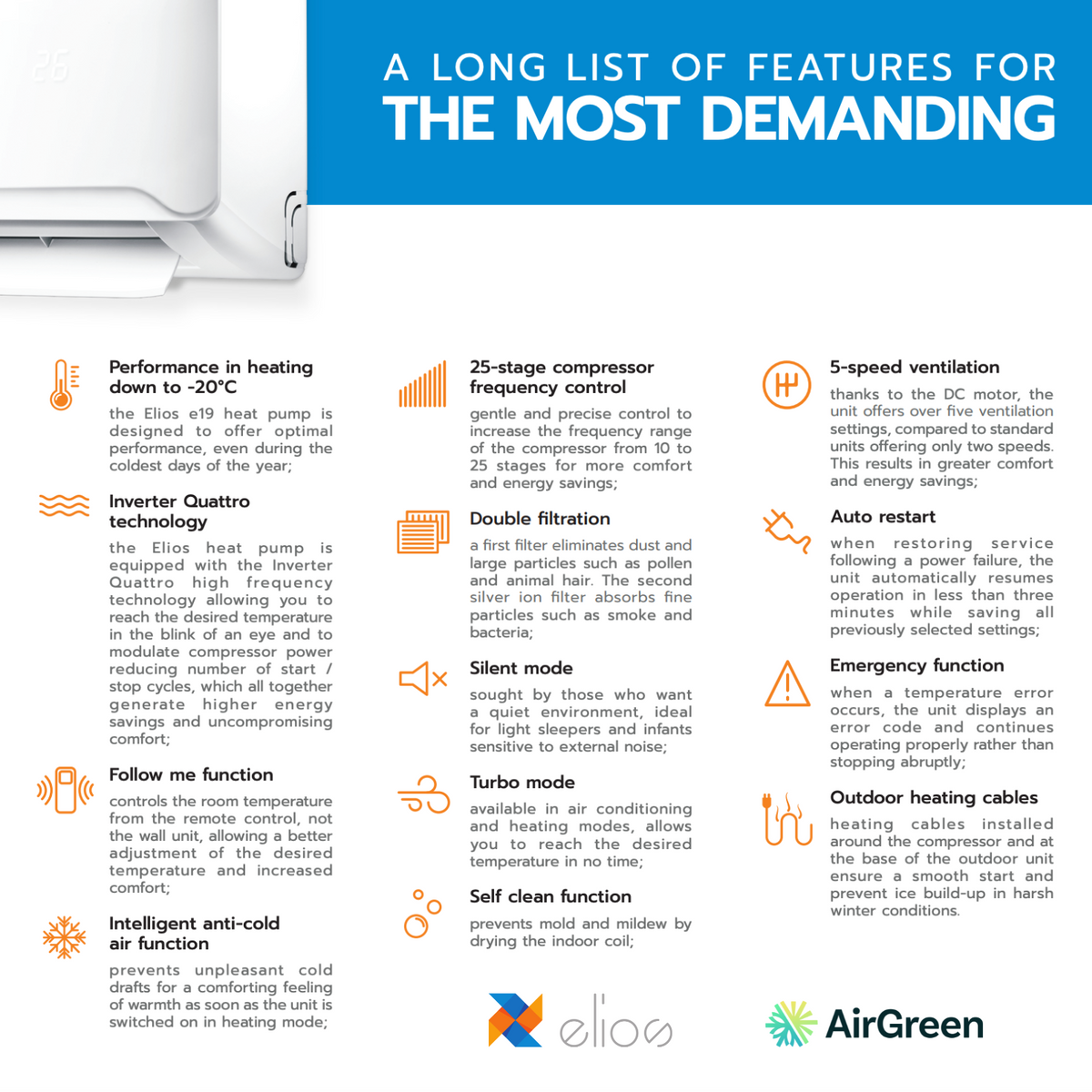 The Elios e19 incorporates Inverter Quattro technology, a significant advancement that allows it to quickly reach the desired temperature while modulating compressor power. This reduces the number of start/stop cycles, translating into considerable energy savings and uncompromised comfort. With a 19.0 SEER efficiency rating, it stands out for its energy efficiency.