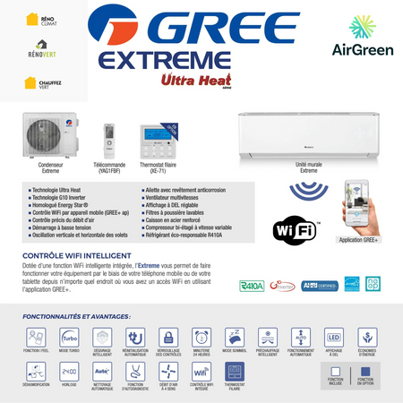 GREE EXTREME ULTRA HEAT (38 SEER) wall-mounted heat pump of 18 000 BTU distributed and installed in Greater Montreal by AirGreen Air Conditioning & Heating.