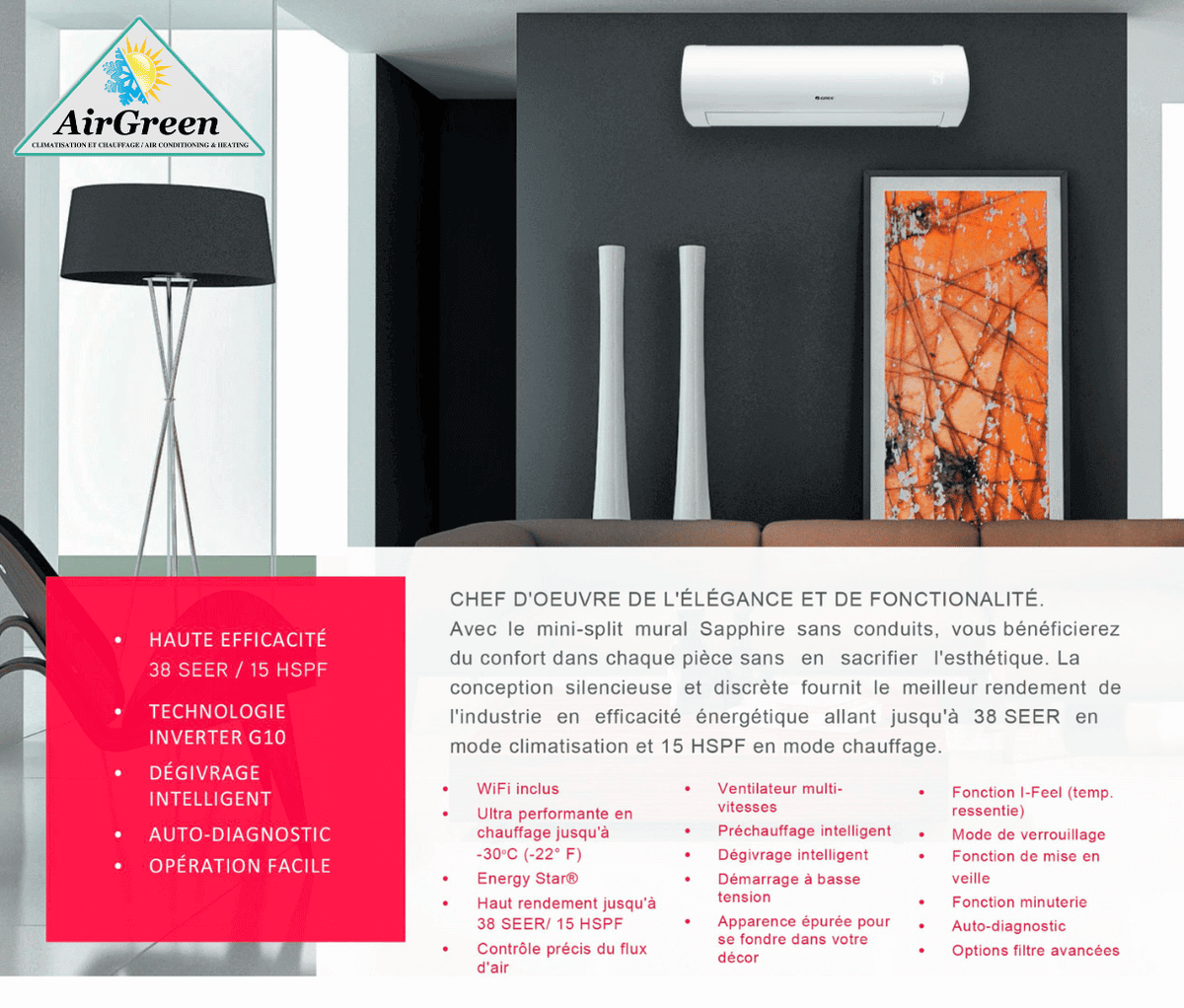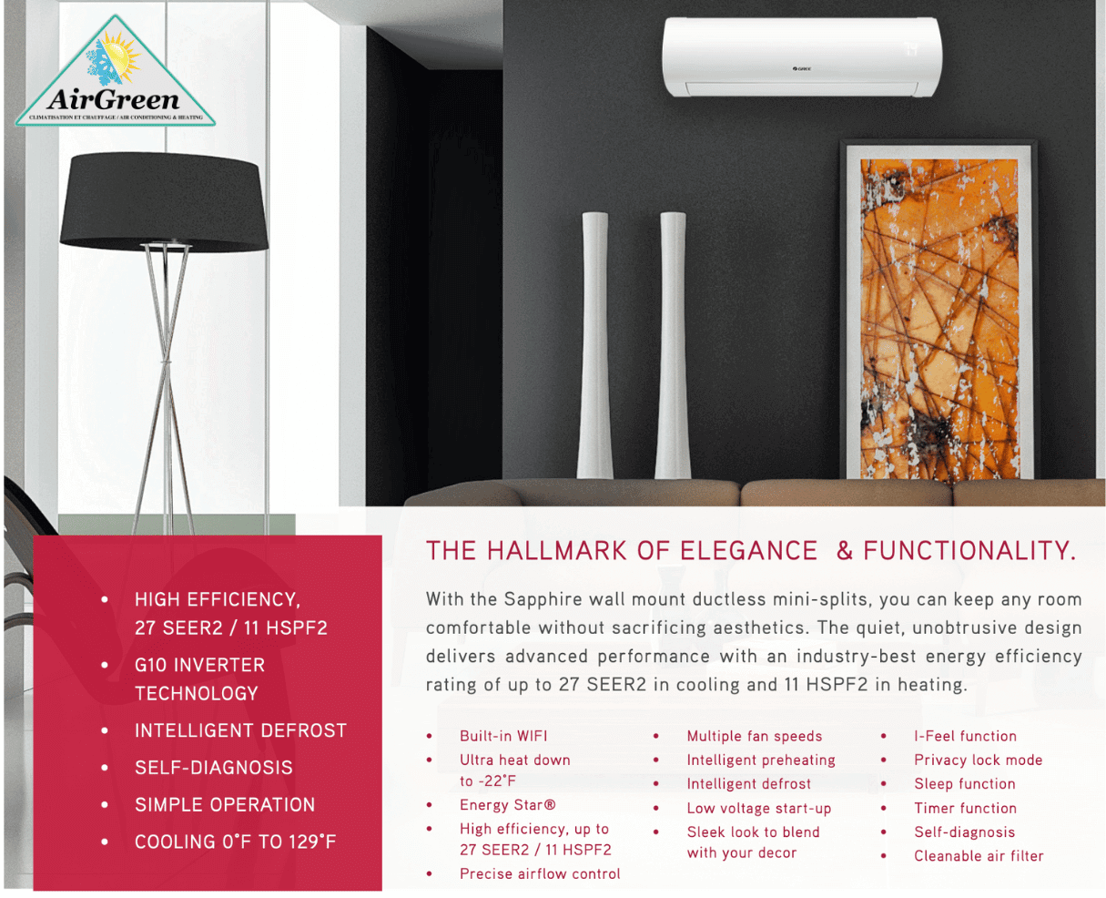 Distribution and installation of the GREE SAPPHIRE 12 000 BTU ductless mini split wall-mounted unit throughout Greater Montreal, Laval, Longueuil, South Shore and North Shore.