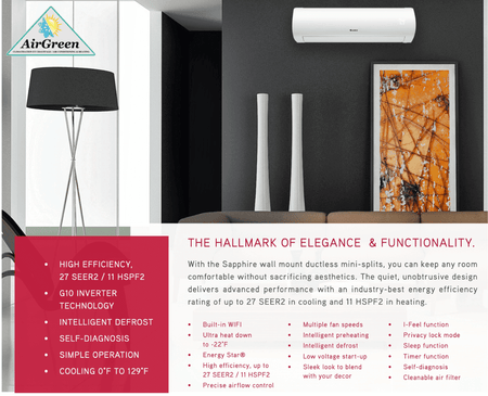 With the GREE Sapphire ductless wall-mounted mini-split, you will enjoy comfort in every room without sacrificing aesthetics. The quiet, low-profile design provides industry-leading energy efficiency ratings of up to 38 SEER in cooling mode and 15 HSPF in heating mode.
