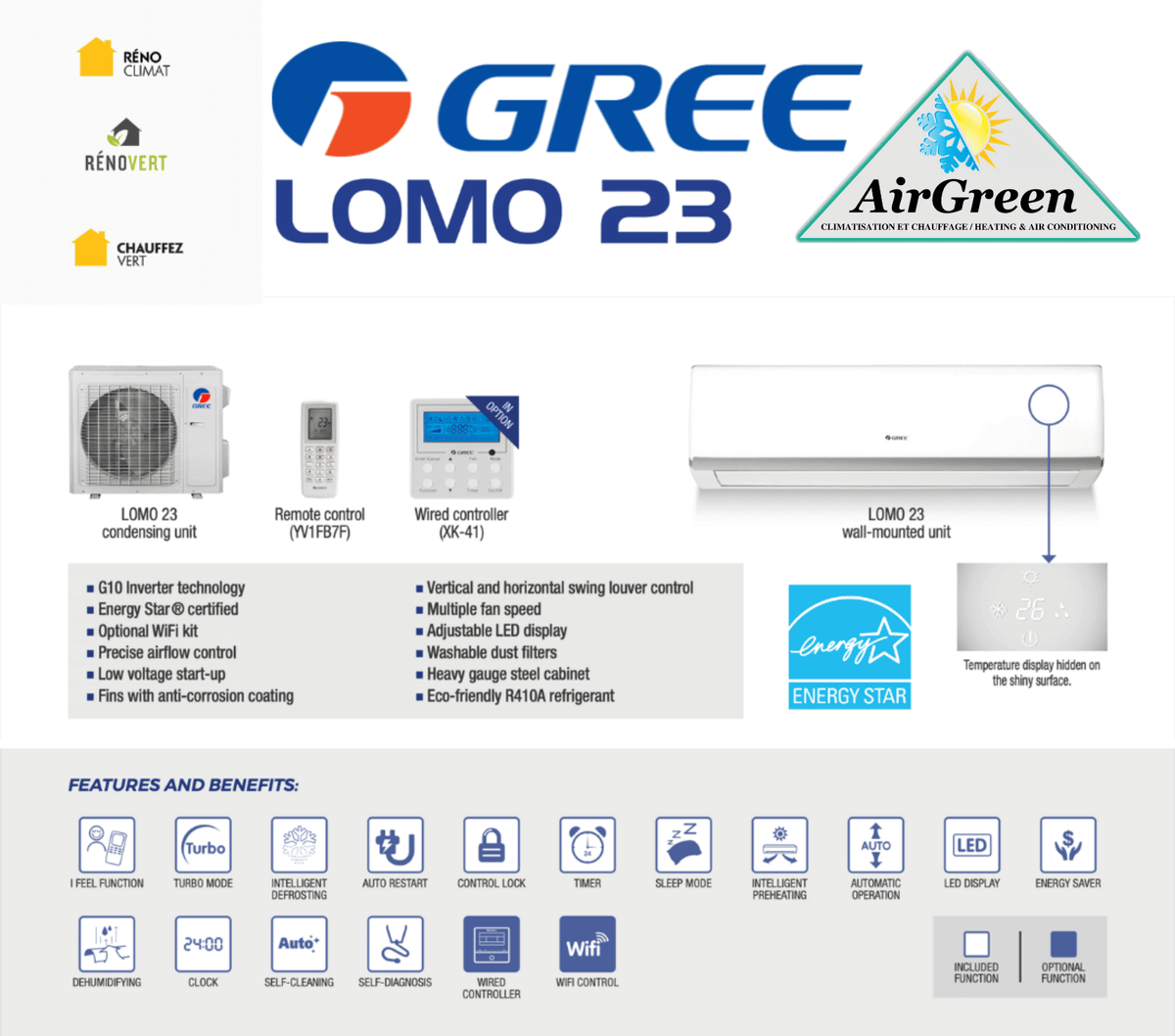The 18 000 BTU GREE LOMO 23 wall-mounted heat pump is Energy Star® certified, so it is subsidized by the federal and provincial governments, up to $5,600 everywhere in Greater Montreal, Laval, Longueuil, North Shore and South Shore.