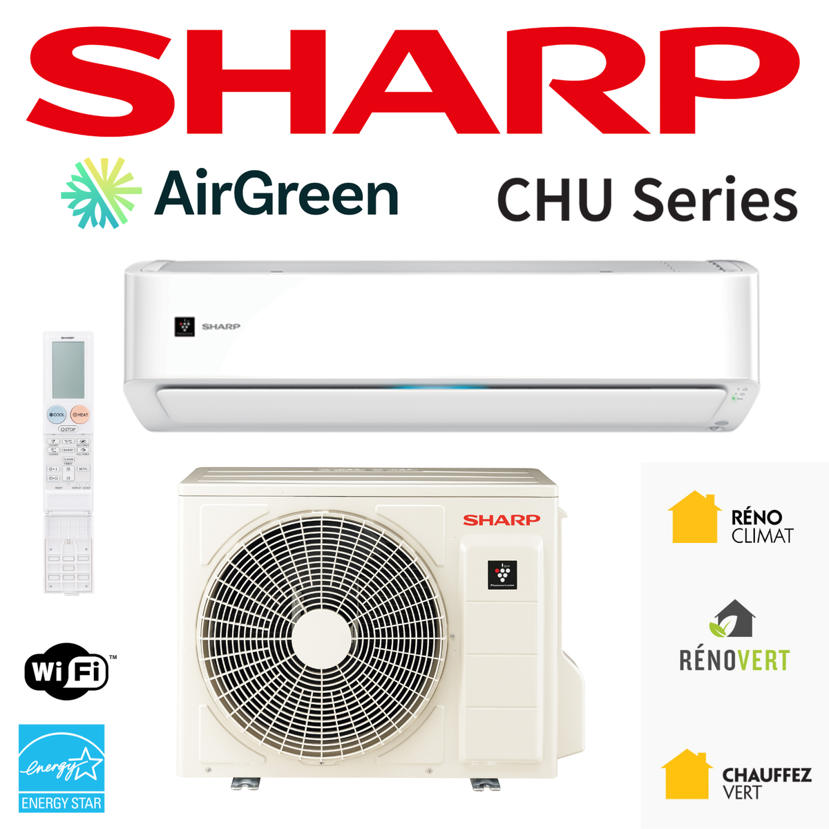 The SHARP CHU wall-mounted heat pump | 18,000 BTU | R32 -30°C is one of the systems we regularly recommend at AirGreen when our clients are looking for a reliable, high-performance solution adapted to the climatic realities of Montreal, Laval, Longueuil, the North Shore and the South Shore .
