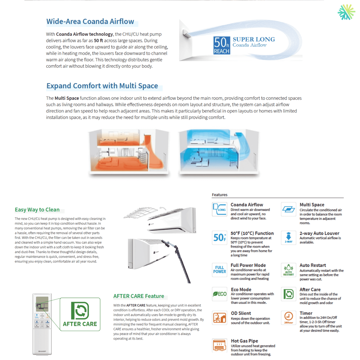 Sharp's CHU/CU series features air technologies designed for consistent comfort. It's important to note that the CU series does not include the motion sensor or automatic left-right oscillation , features reserved for the CHU series.