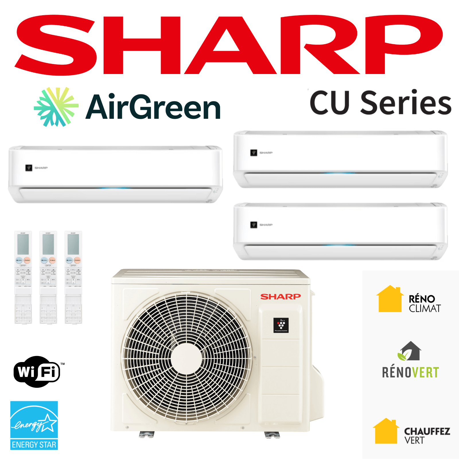 At AirGreen, we install HVAC systems adapted to the climatic conditions of Montreal, Laval, Longueuil, the North Shore, and the South Shore . The SHARP CU TripleZone Heat Pump | R32 -30°C is one of the models we regularly recommend for single-family homes, condos, and multi-unit dwellings seeking a high-performance, stable, and energy-efficient multi-zone solution.