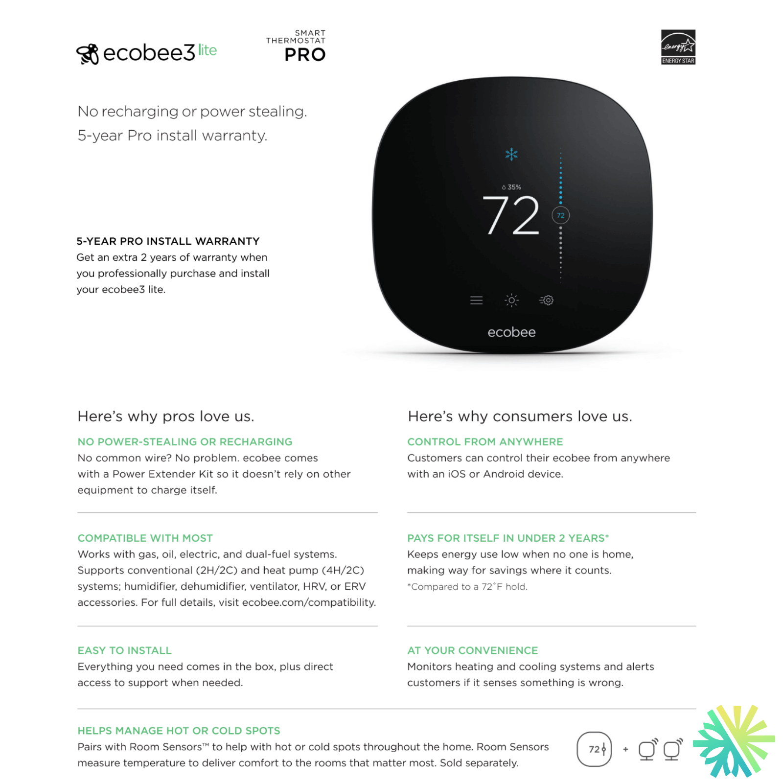 - Smart Savings: With the eco+ technology, the Ecobee 3 Lite Pro learns from your habits and automatically optimizes settings to maximize energy savings without sacrificing comfort.