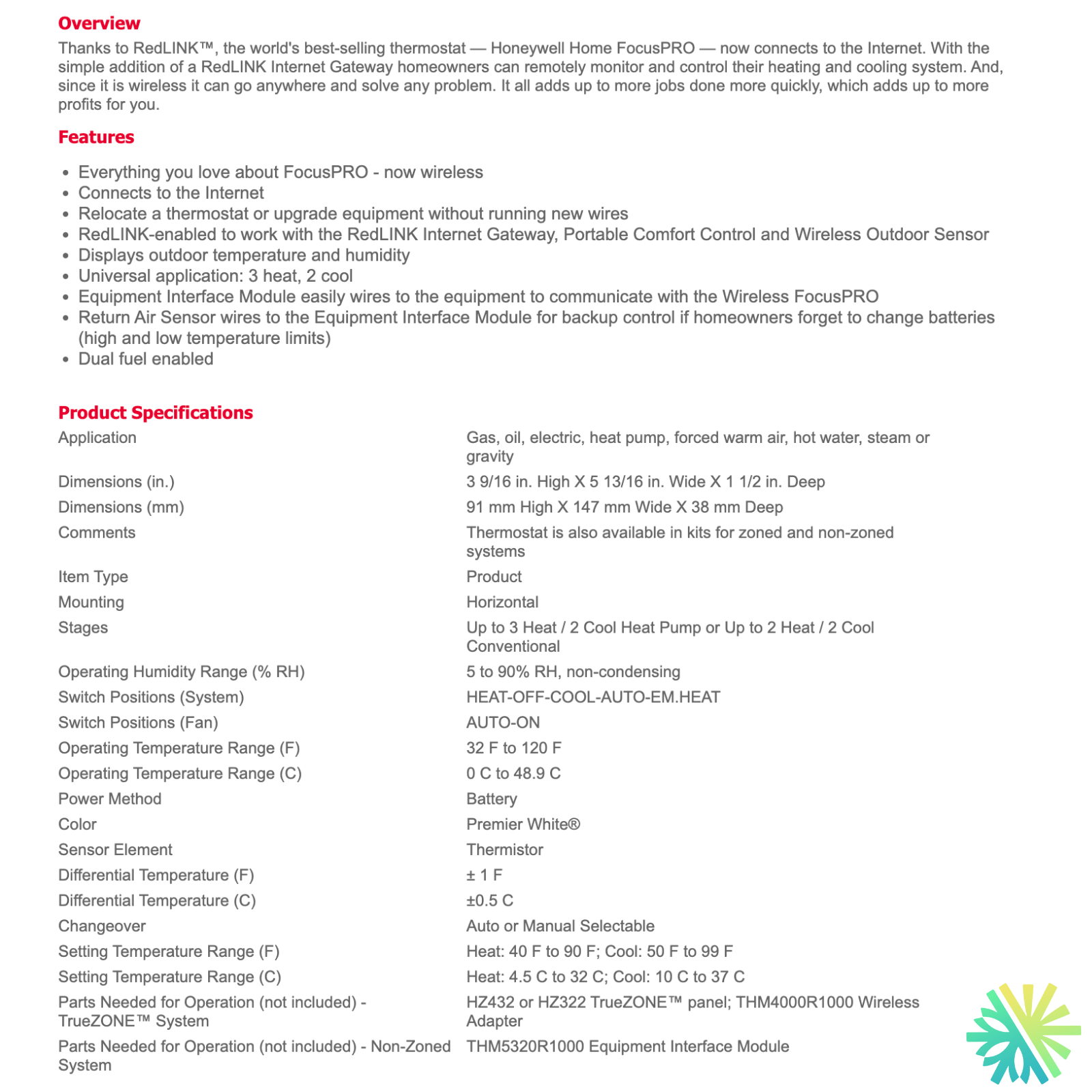 The Honeywell Wireless FocusPRO 5000 thermostat (model TH5320R1002/U) is equipped with a backlit display and offers unparalleled connectivity thanks to RedLINK™ technology. This system enables wireless Internet connection, thus allowing remote control of your heating and cooling system.