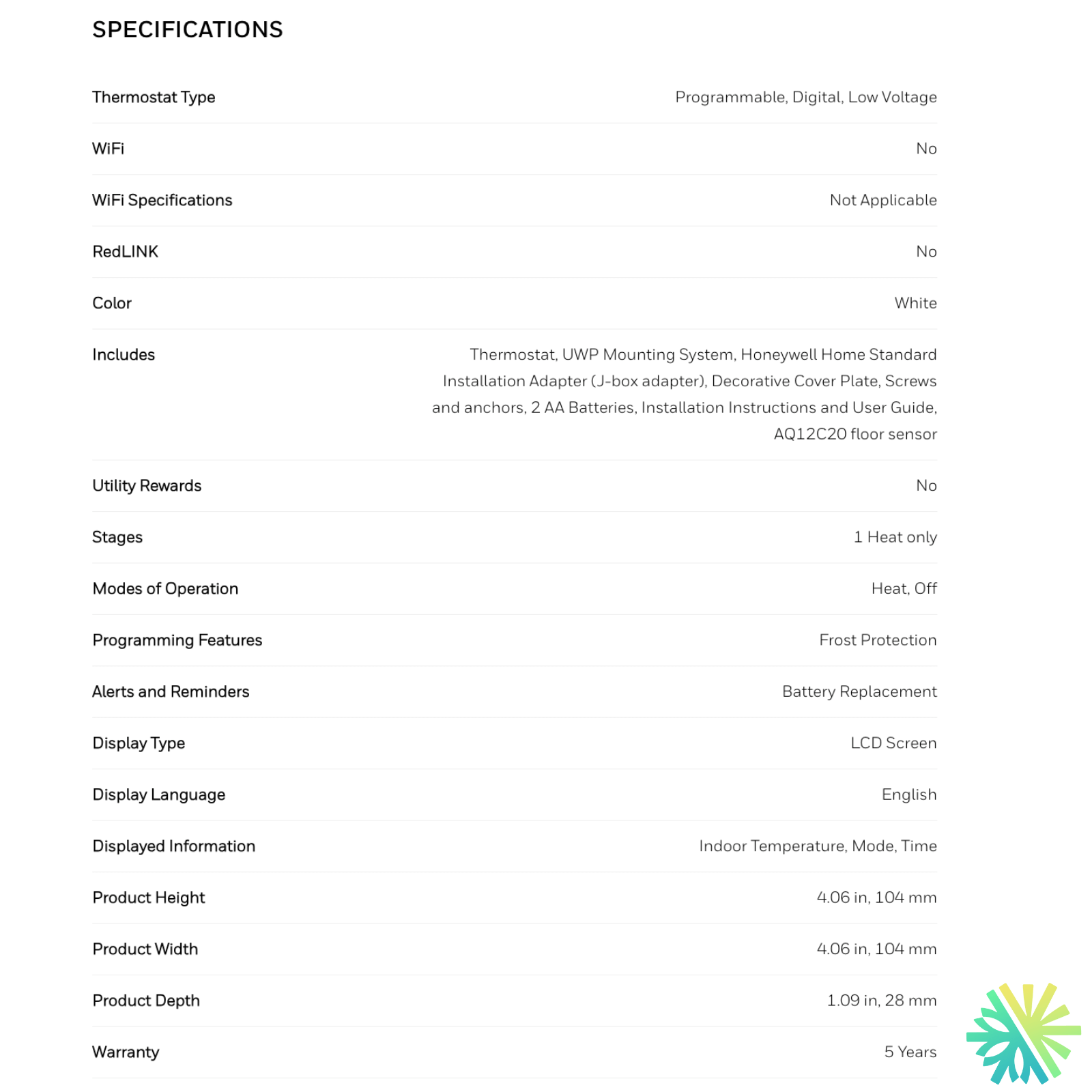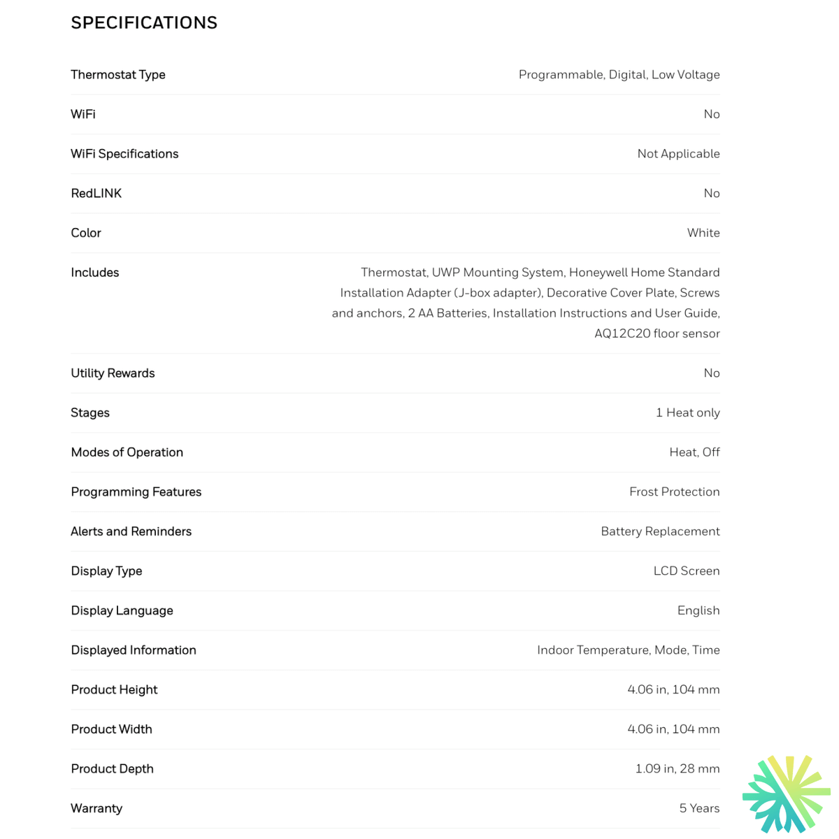 - Includes: Thermostat, UWP Mounting System, Honeywell Home Standard Installation Adapter (J-box adapter), Decorative Cover Plate, Screws and anchors, 2 AA Batteries, Installation Instructions and User Guide, AQ12C20 floor sensor