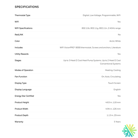 This model is not limited to temperature regulation; it can also control whole-home humidifiers, dehumidifiers, or ventilators, offering a level of comfort that is fully adjusted to your specific needs. Additionally, with the Adaptive Intelligent Recovery feature, the thermostat learns from your habits to anticipate the ideal time to activate the heating or cooling system, always welcoming you to a perfectly adjusted environment.