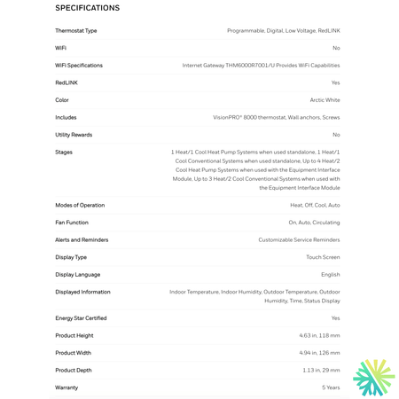 The Honeywell VisionPRO® 8000 thermostat stands out for its ability to centralize the control of your home comfort system through a single, easy-to-use interface. Thanks to RedLINK® wireless technology, this device offers the possibility to add accessories such as wireless indoor sensors, an outdoor sensor, and even a RedLINK® Internet Gateway to optimize the balance between comfort, safety, and energy efficiency.