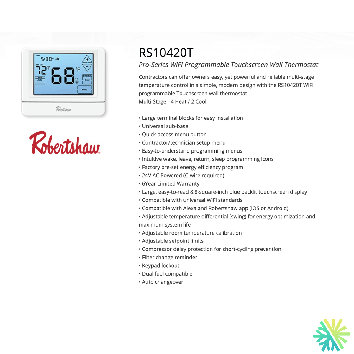 With a 6-year limited warranty, Robertshaw ensures that your investment is protected. At AirGreen, we also offer expert installation and responsive after-sales service to ensure that every aspect of your experience with the RS10420T is hassle-free.