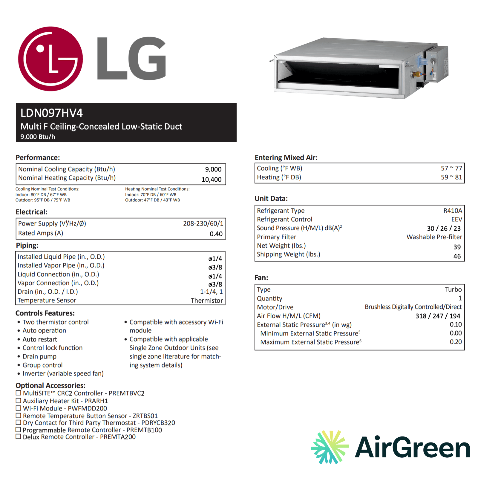 The LG low static pressure duct fan, with its 9,000 BTU cooling capacity, is a discreet and powerful air conditioning solution, designed to seamlessly integrate into any indoor space. Energy Star certified, this system ensures minimal energy consumption while providing optimal cooling performance.