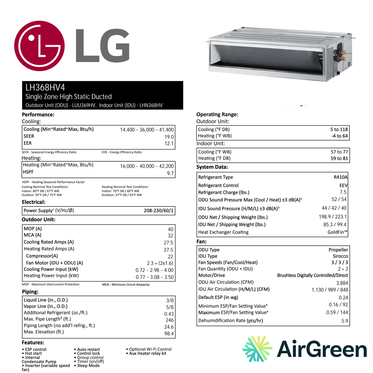 This cutting-edge system, with the serial number LHN368HV, is equipped to meet the most demanding cooling needs, boasting an impressive capacity of 36,000 BTU. Eco-friendly, it is Energy Star certified, ensuring reduced consumption and minimal environmental impact. Through the use of R-410A Freon, this system ensures optimal cooling performance while remaining environmentally respectful.