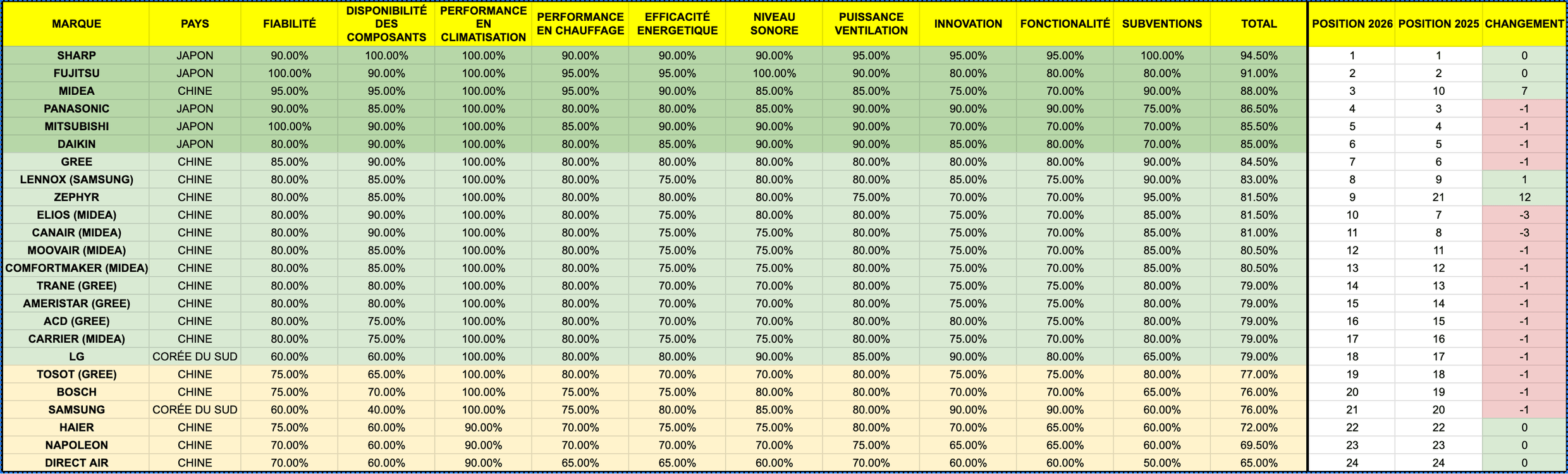 En résumé, Daikin propose une technologie intéressante, mais son modèle fermé (installateurs exclusifs + pièces limitées) et ses faibles subventions en font un choix moins compétitif en 2026, surtout pour les clients qui veulent un investissement fiable et facile à entretenir à long terme.