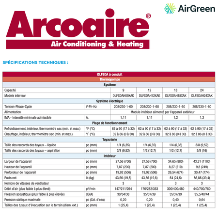 ArcoAire Gainable DLFSDA à Conduit | 9 000 BTU | Montréal, Laval, Longueuil, Rive Sud et Rive Nord