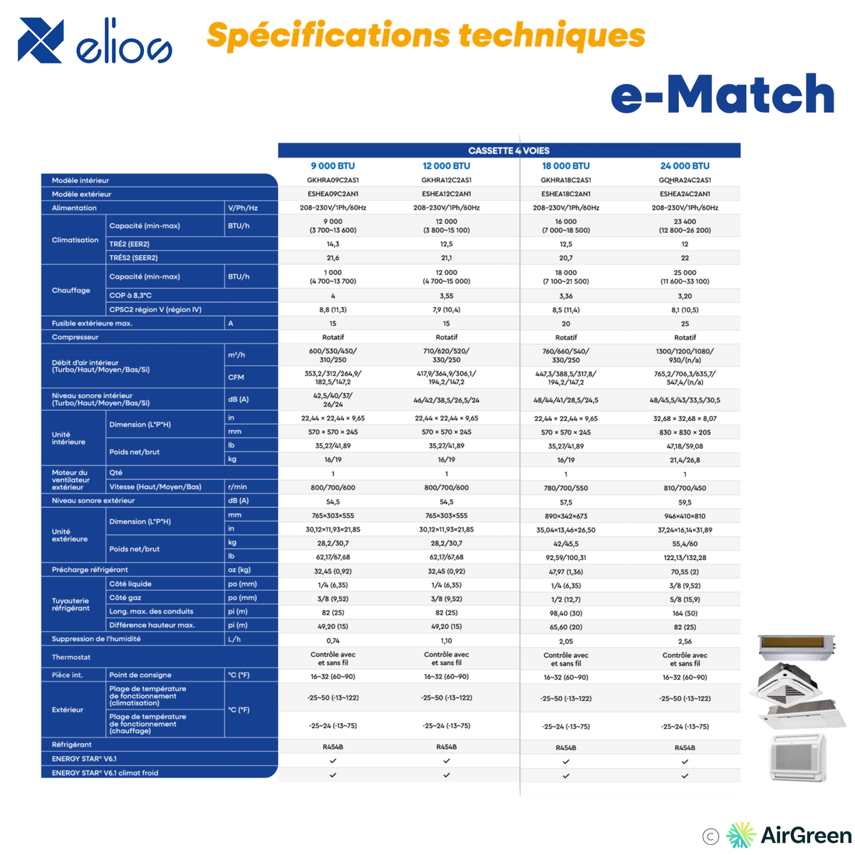 Cassette 4 Voies ELIOS | 9 000 BTU R454B | Installation Grand Montréal