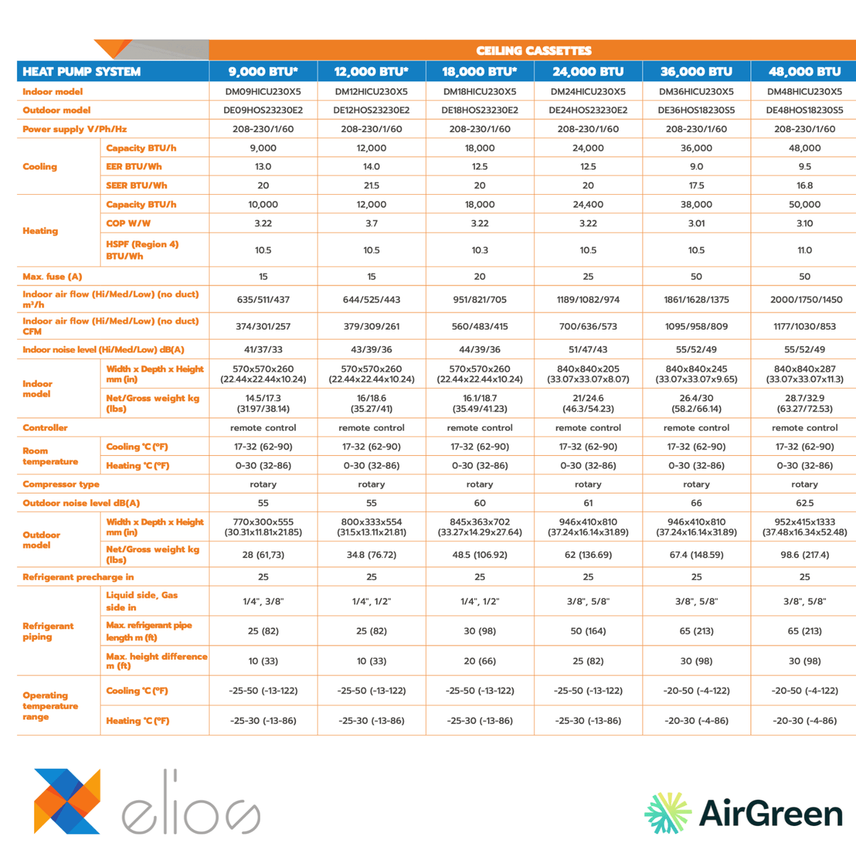Cette thermopompe cassette ELIOS se distingue par ses caractéristiques précises et avancées, répondant aux attentes les plus élevées en matière de confort et d’efficacité énergétique :