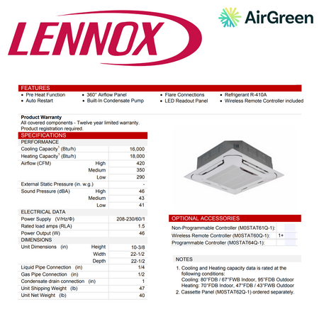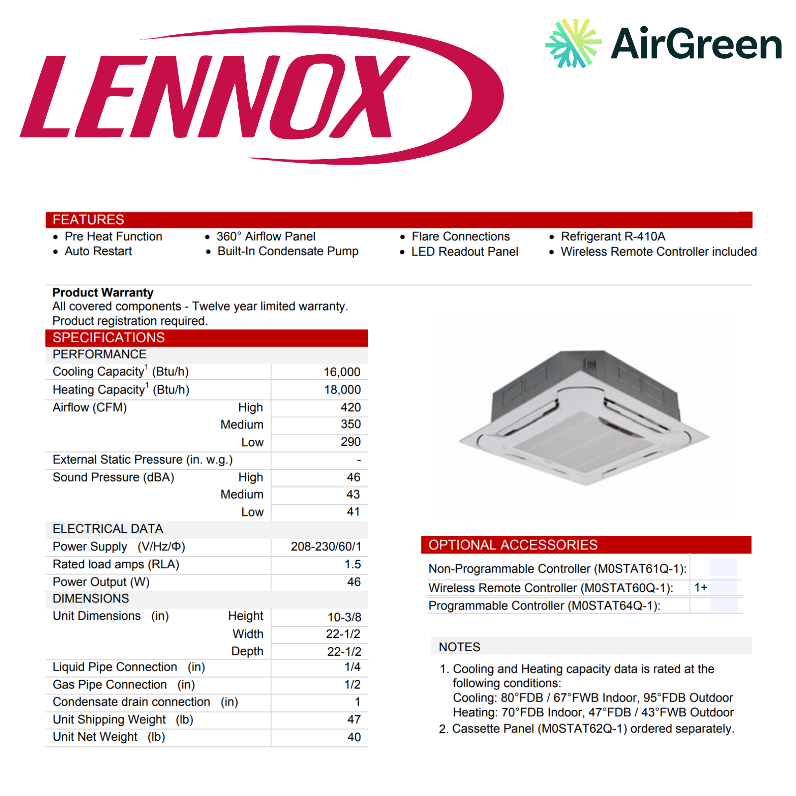 Cassette de Plafond Lennox M22A | 18000 BTU | Montréal, Laval, Longueuil, Rive Sud & Rive Nord