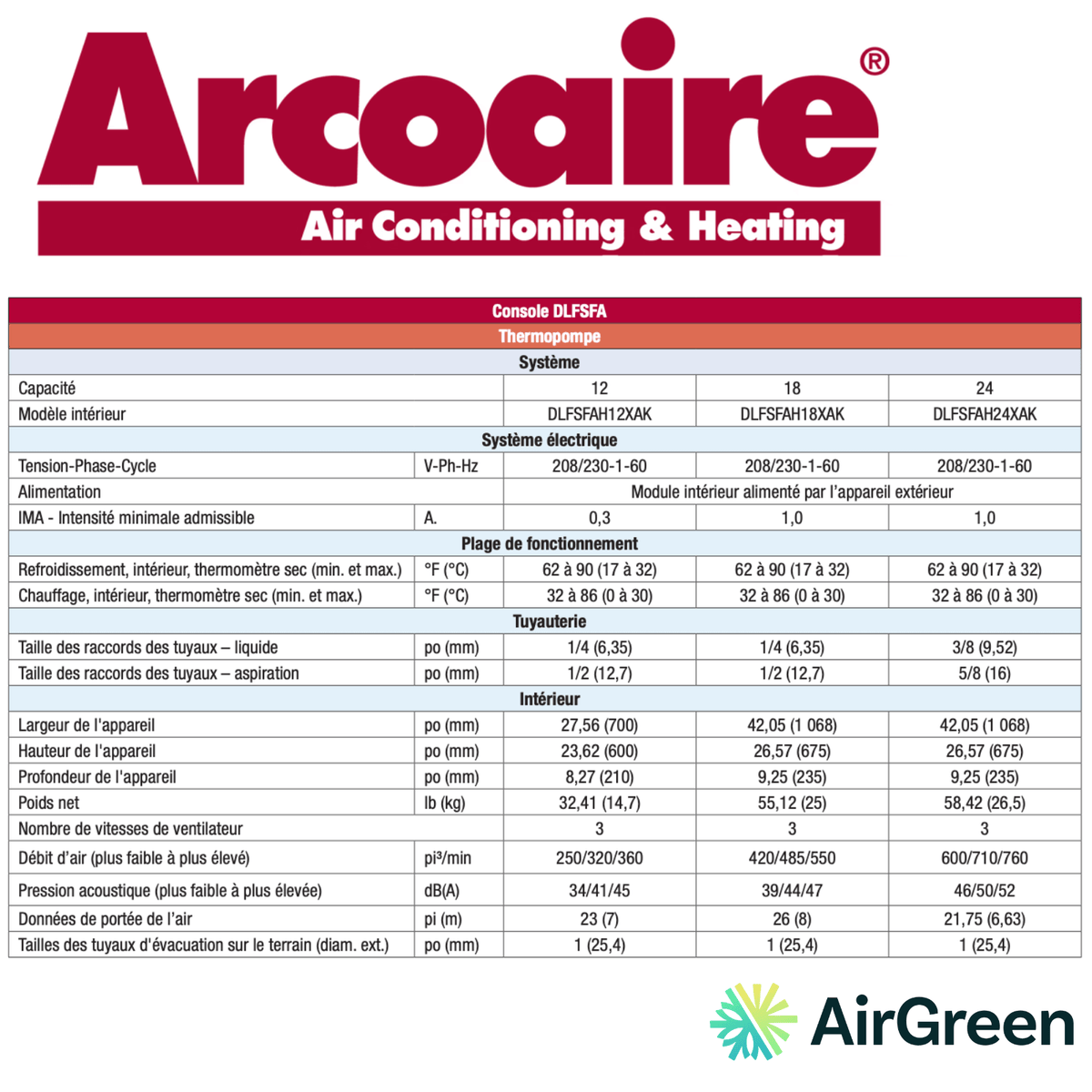 La Console de Plancher ARCOAIRE se distingue par sa capacité à offrir un refroidissement et un chauffage efficaces, avec une capacité impressionnante de 24 000 BTU. Son certification Energy Star garantit une consommation d'énergie optimisée, contribuant ainsi à réduire votre empreinte écologique et vos factures d'énergie.