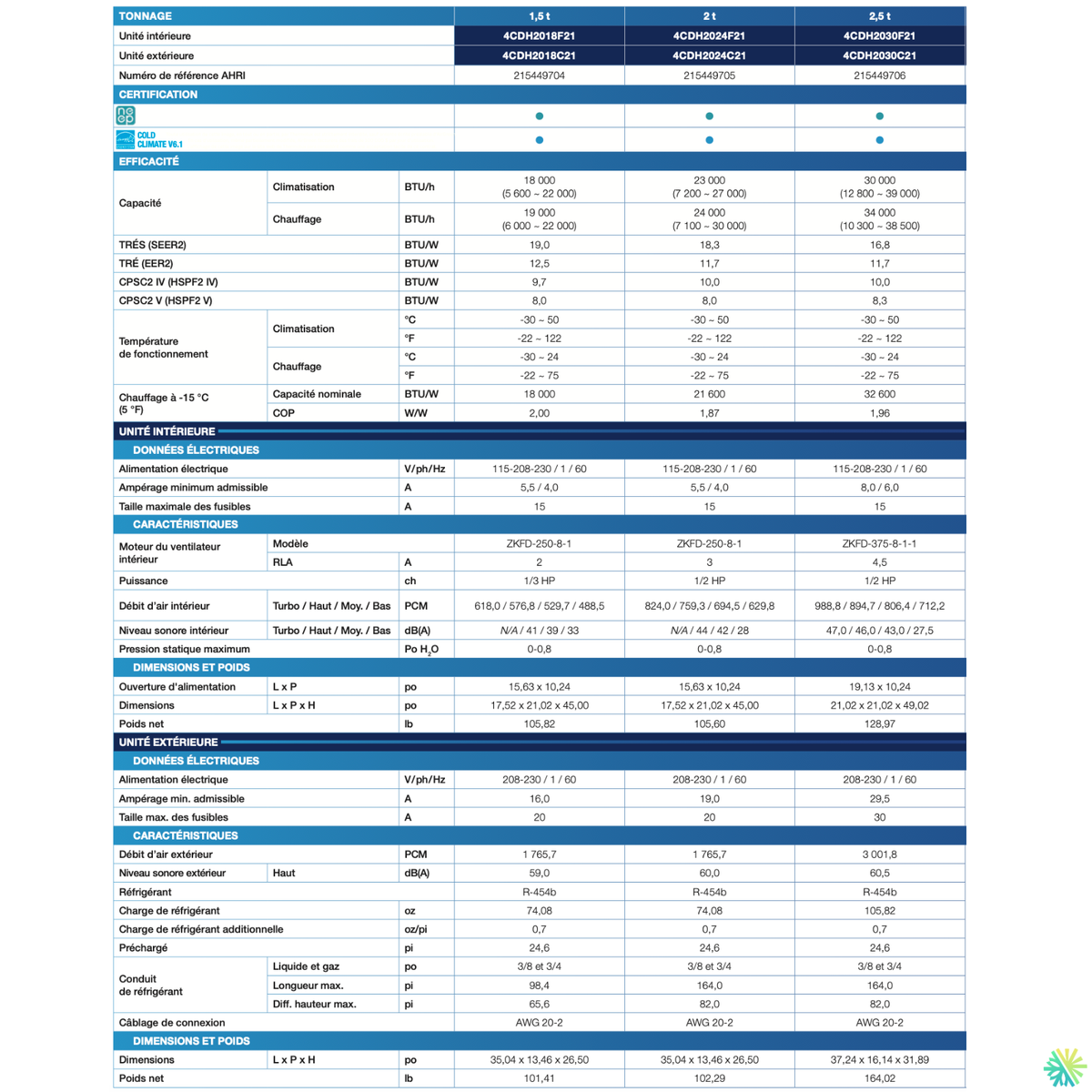 La thermopompe centrale qui l’accompagne délivre jusqu’à 19 SEER2 et 9,7 HSPF2, tandis que la fournaise électrique complète assure un appoint de chauffage intelligent grâce à ses modules de 5 à 25 kW.