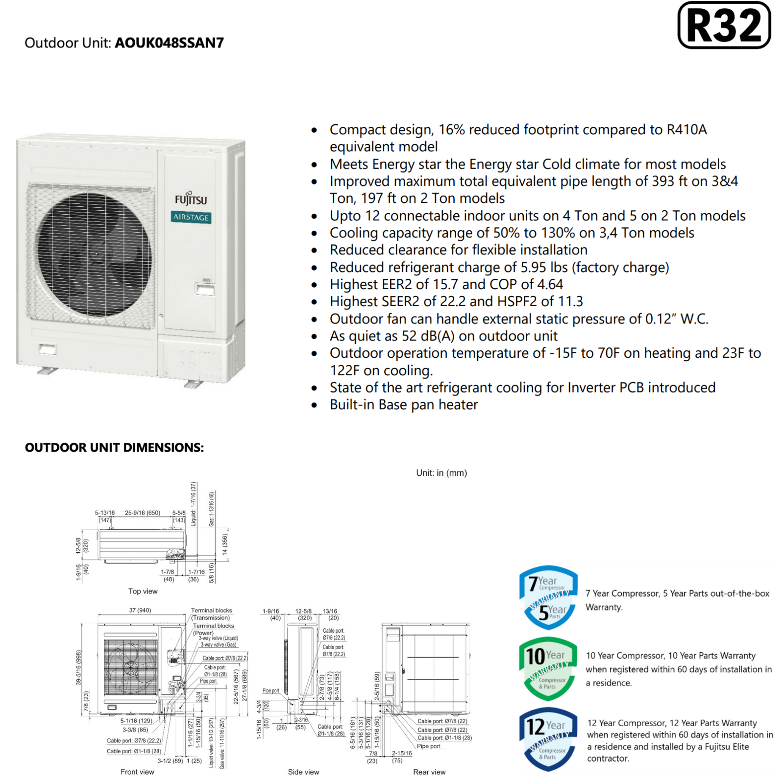 Avec ses dimensions d’environ 39,31 × 12,63 × 37 po, l’unité extérieure du J-7S occupe moins d’espace que plusieurs systèmes de capacité comparable. Elle peut être installée sous une fenêtre, sur un balcon technique ou dans une cour restreinte, sans compromettre la circulation d’air ni l’accessibilité pour l’entretien.