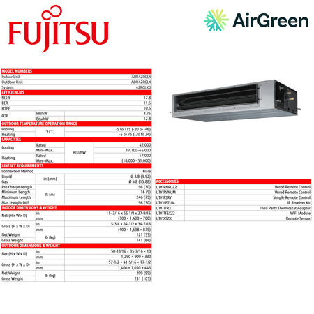 - Fonctionnement en conditions extrêmes: Capable de chauffer efficacement jusqu'à des températures extérieures de -5° F, le Gainable Fujitsu RGLX assure votre confort toute l'année.