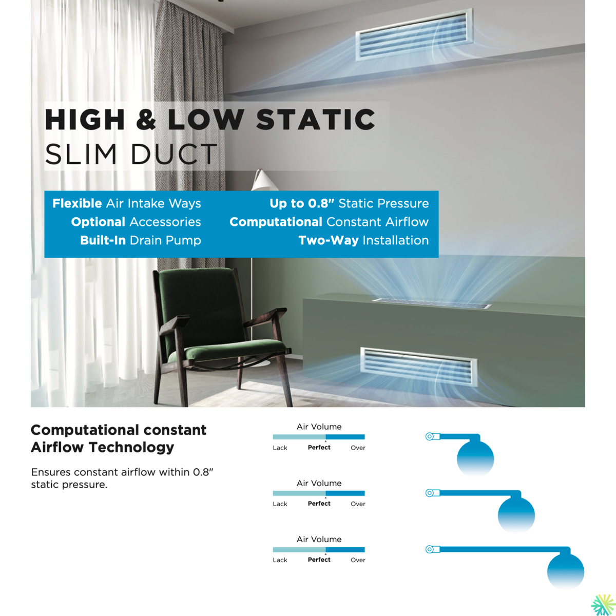 L’unité se distingue également par sa technologie à débit d’air constant (Computational Constant Airflow), assurant une pression statique jusqu’à 0,8" — une prouesse technique qui garantit une température uniforme dans chaque pièce, quelles que soient les conditions extérieures.