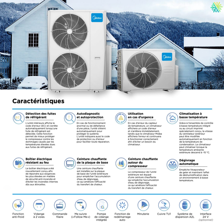 La robustesse du système MIDEA ne repose pas uniquement sur ses performances : elle découle aussi d’une conception minutieuse adaptée aux conditions extrêmes du Québec. Cette thermopompe est équipée de dispositifs qui garantissent un fonctionnement stable et sécurisé toute l’année :
