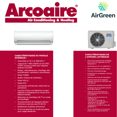 Chez AirGreen, société HVAC de renom basée à Montréal, nous sommes fiers de présenter la Thermopompe Murale ARCOAIRE DURACOMFORT, un joyau de technologie et d'efficacité. Opérant dans la grande région de Montréal, Laval, Longueuil ainsi que les Rives-Nord et Sud, nous visons à offrir des solutions de chauffage et de climatisation qui allient haute performance et respect de l'environnement.