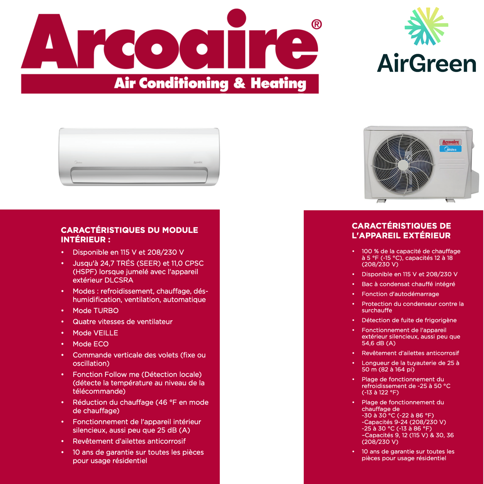 AirGreen, votre spécialiste HVAC à Montréal, Laval, Longueuil, North Shore et South Shore, présente fièrement la thermopompe murale ARCOAIRE DURACOMFORT, un joyau de technologie conçu pour transcender vos attentes en matière de chauffage et de climatisation. Avec son design élégant et ses performances hors normes, la DURACOMFORT est bien plus qu'une simple thermopompe ; c'est une révolution dans le confort domestique.