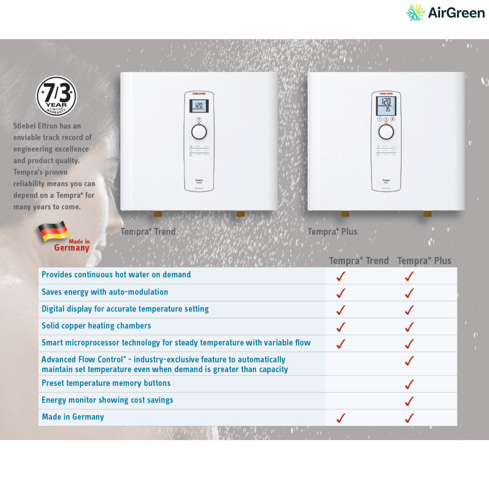 Chez AirGreen, nous sommes spécialisés dans l’installation de chauffe-eau électriques sans réservoir comme le Tempra 36 Plus. Nous nous engageons à offrir :
