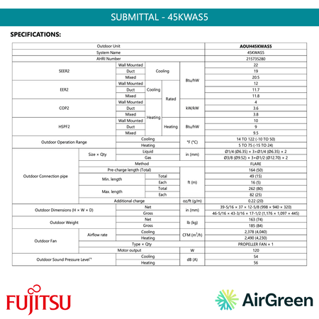 Fiche technique de la thermopompe FUJITSU Aquila R32 | 45 000 BTU